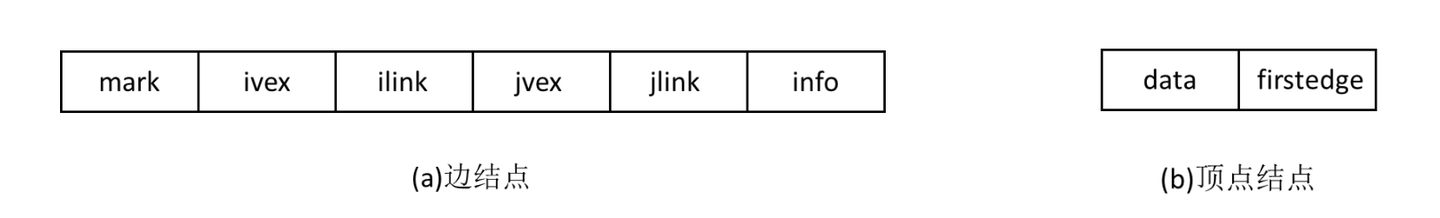 邻接多重表的结构和十字链表类似。在邻接多重表中,每一条边用一个结点表示,它由 6 个域组成。其中,mark 为标志域,可用以标记该条边是否被搜索过;ivex 和 jvex 为该边依附的两个顶点在图中的位置;ilink 指向下一条依附于顶点 ivex 的边;jlink 指向下一条依附于顶点 jvex 的边;info 指向和边相关的各种信息的指针域。