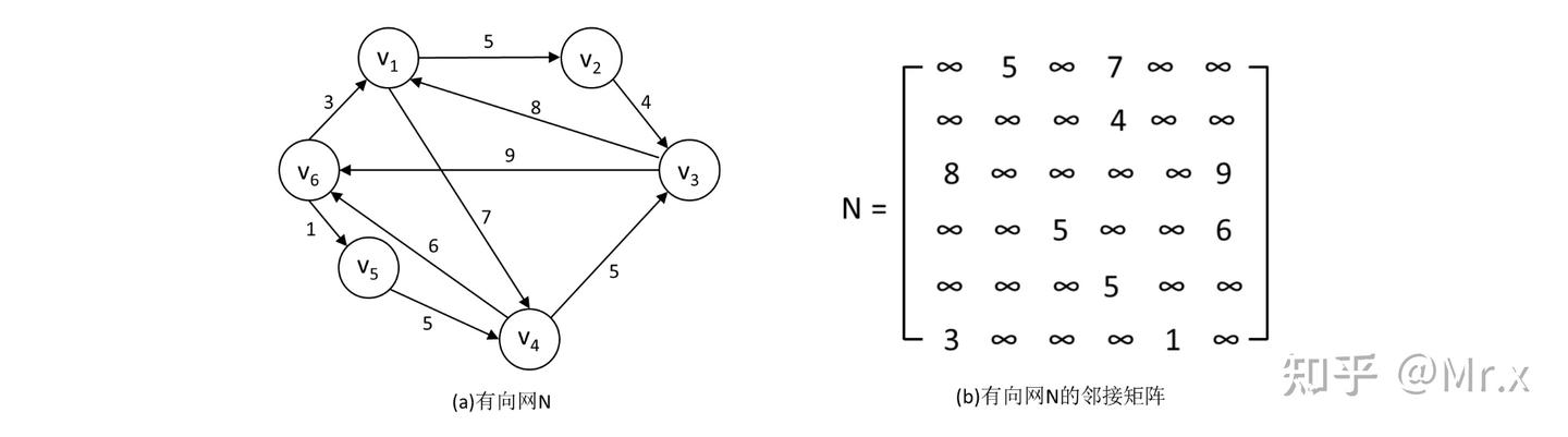 )的图称为稀疏图,反之称为稠密图。 - 权和网:若在图的每条边上标上具有某种含义的数值,该数值称为该边上的权值。这些权值可以表示从一个顶点到另一个顶点的距离或耗费。这种带权的图通常称为网。