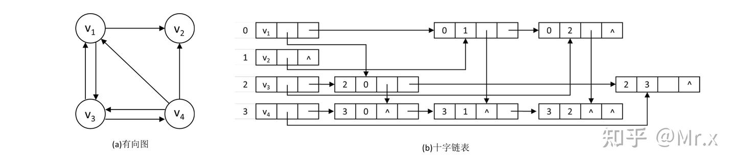 若将有向图的邻接矩阵看成是稀疏矩阵的话,则十字链表也可以看成是邻接矩阵的链式存储结构,在图的十字链表中,弧结点所在的链表非循环链表,结点之间相对位置自然形成,不一定按顶点序号有序,表头结点即顶点结点,它们之间不是链接,而是顺序存储。