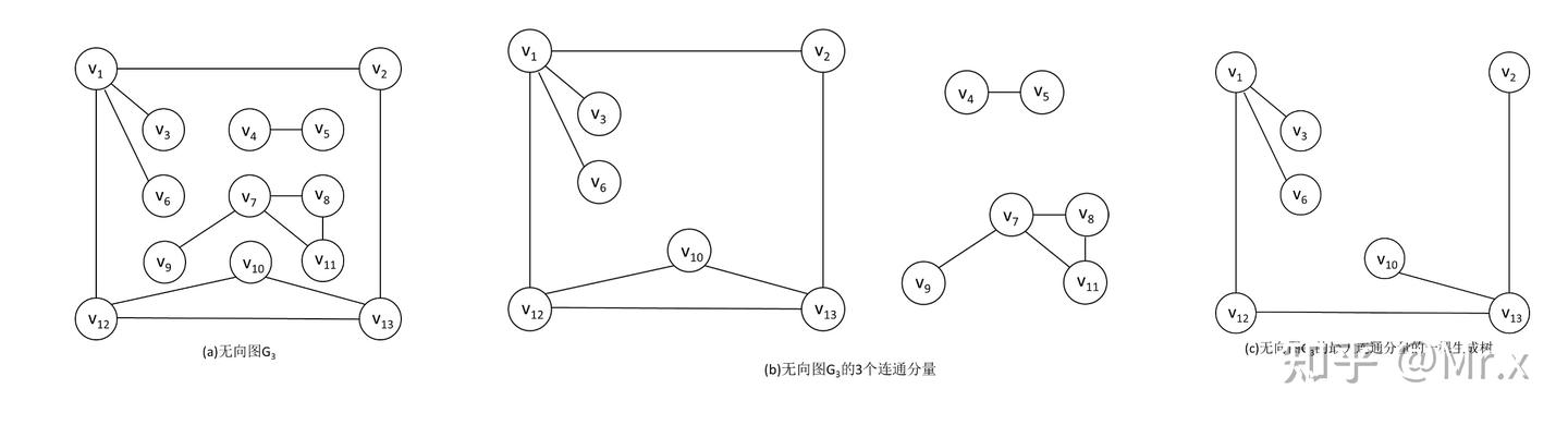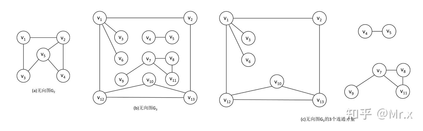 中,如果从顶点 到顶点 有路径,则称 和 是连通的。如果对于图中任意两个顶点 , 和 都是连通的,则称 是连通图。而所谓连通分量,指的是无向图中的极大连通子图。例如,下图(a)就是一个连通图,而图(b)则是非连通图,但它有 3 个连通分量,见图(c)。