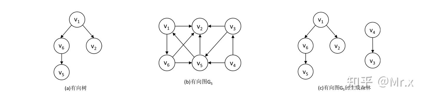 - 有向树和生成森林:有一个顶点的入度为 0,其余顶点的入度均为 1 的有向图称为有向树。一个有向图的生成森林由若干棵有向树组成,含有图中全部顶点,但只有足以构成若干棵不相交的有向树的弧。例如,下图(a)是一棵有向树,图(b)是一个有向图,它的森林是图(c)。