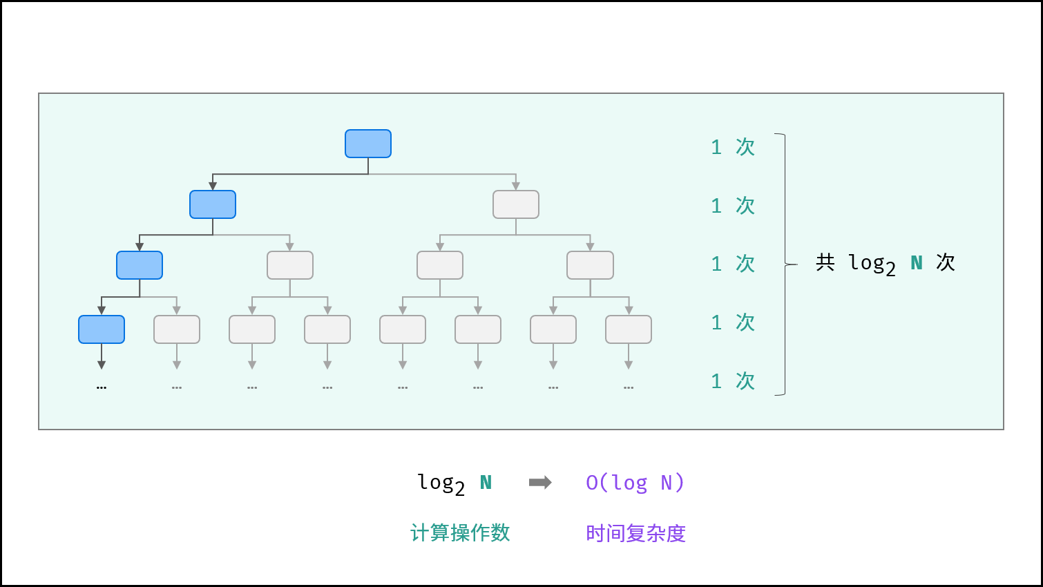 如下图所示,为二分查找的时间复杂度示意图,每次二分将搜索区间缩小一半。