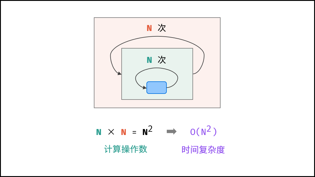 示例:冒泡排序。 第一层和第二层时间复杂度分别为 O(N) 和 O(N),则总体时间复杂度为 O(N^2)