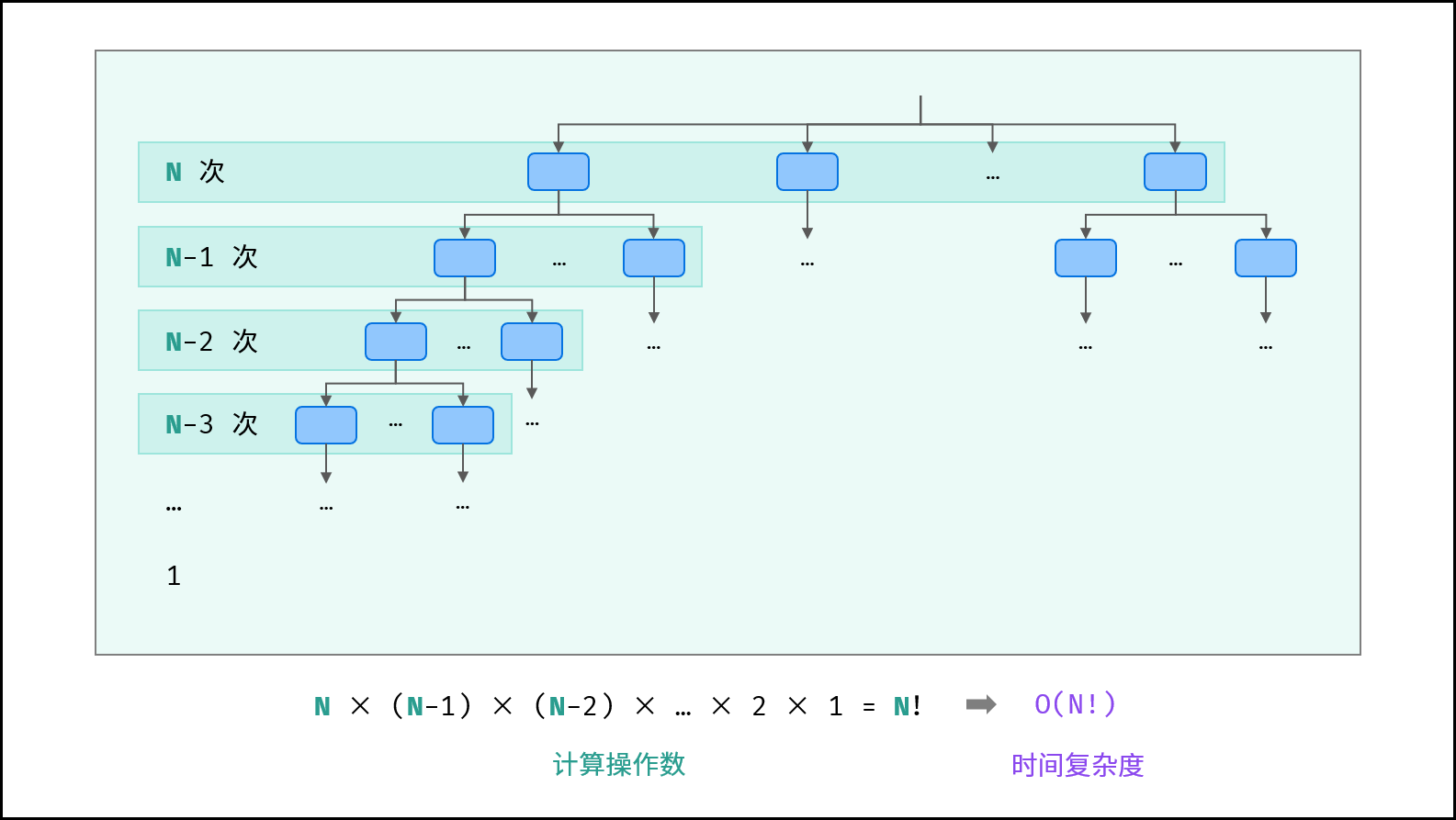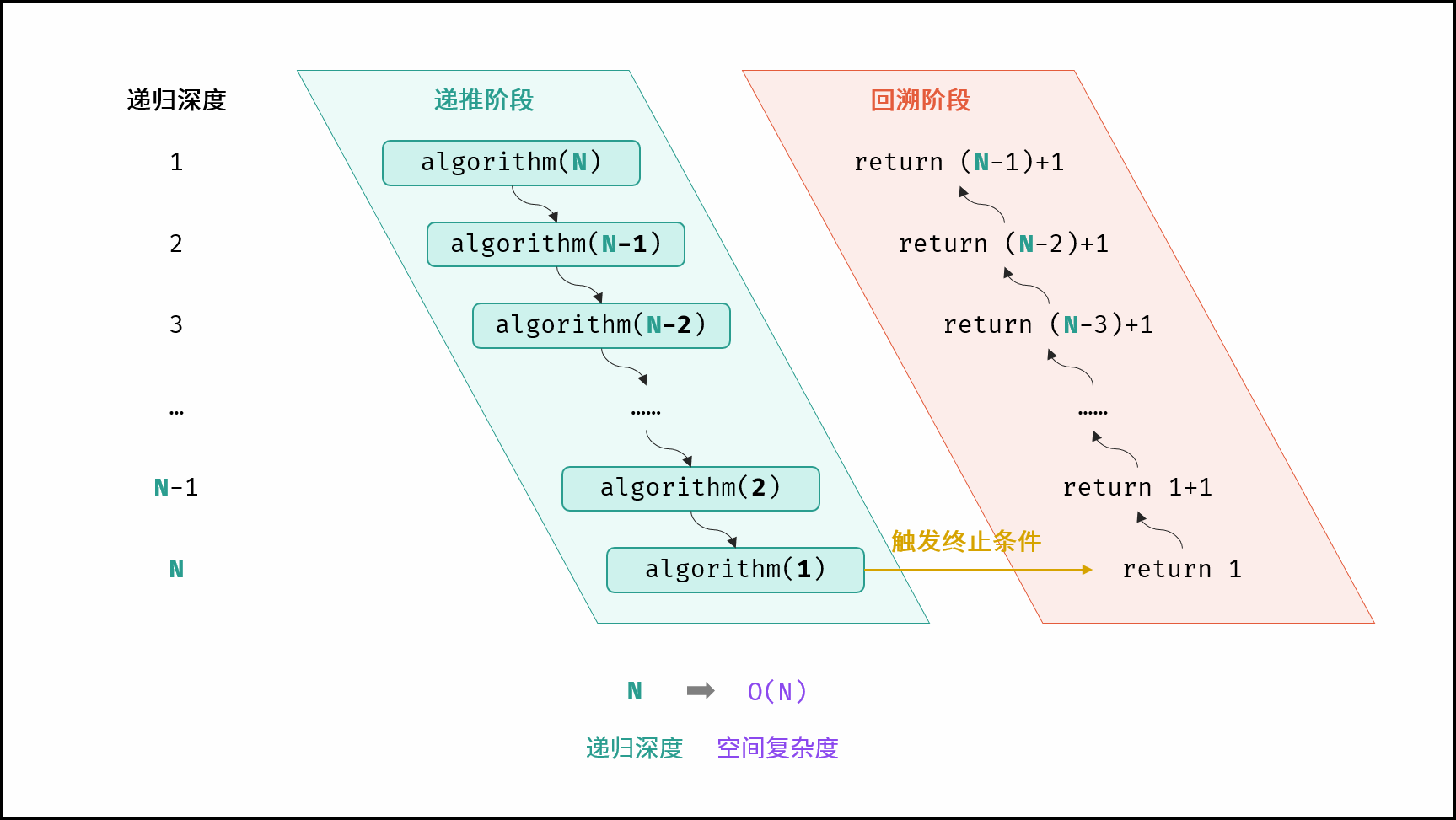 每次递归调用参数递减 1,直到 N ≤ 0。递归深度为 N 次(例如 N=5 时调用链为 algorithm(5) → algorithm(4) → … → algorithm(0)) - 每次递归的临时空间占用