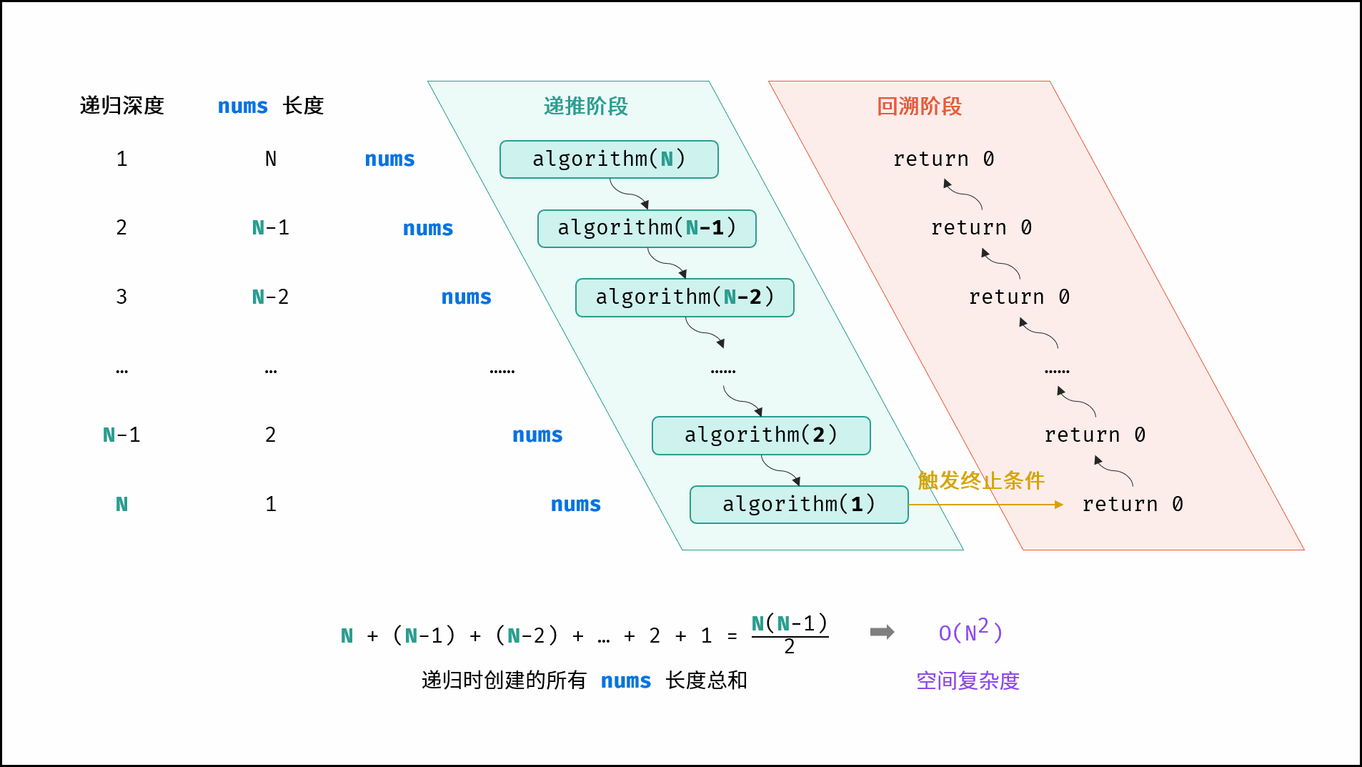 。随着递归深度增加,数组长度的变化为 N, N-1, N-2, …, 1 - 空间累计计算