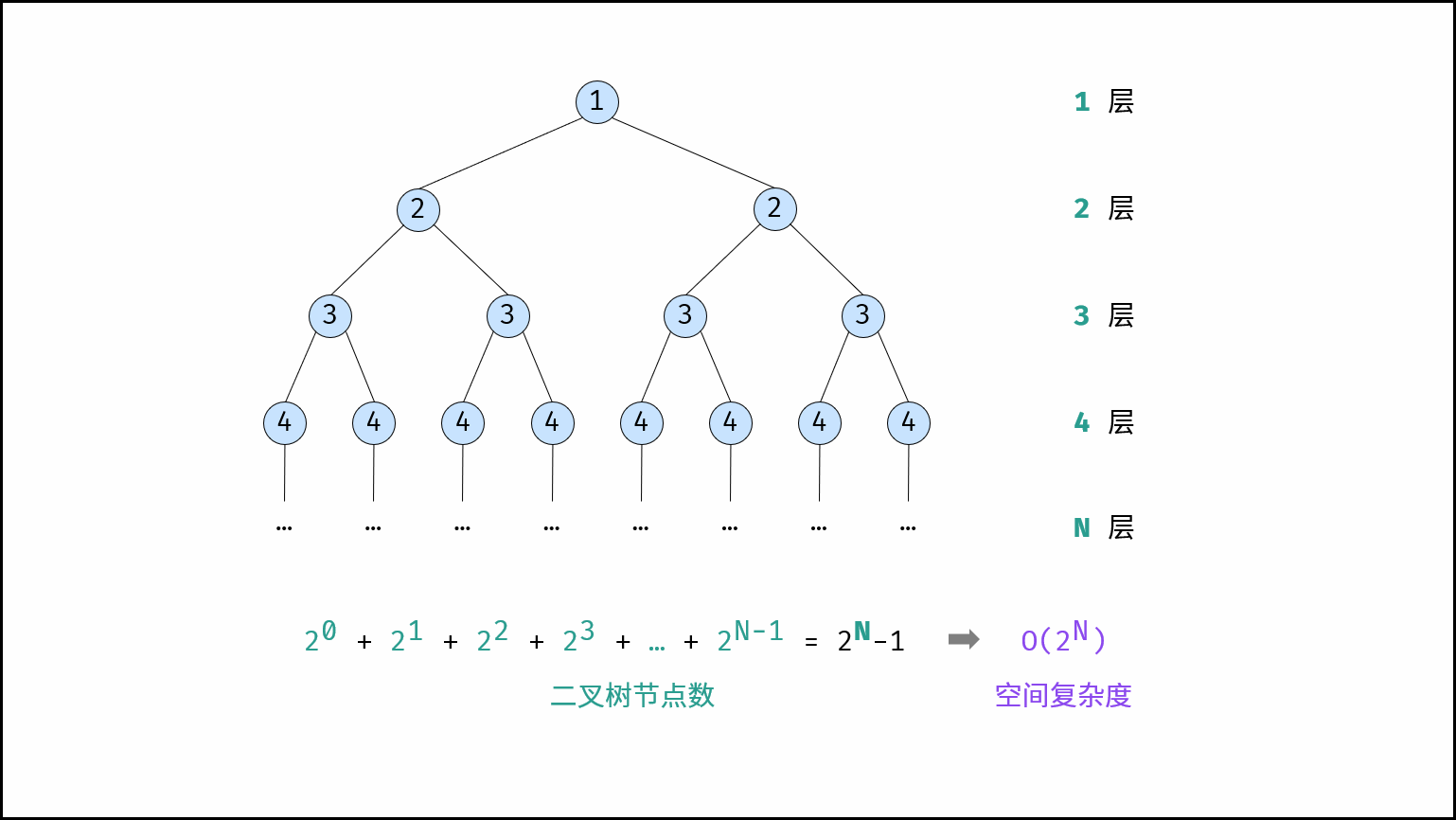 高度为 N 的满二叉树,节点总数为 2ᴺ,空间复杂度为 O(2ᴺ)。