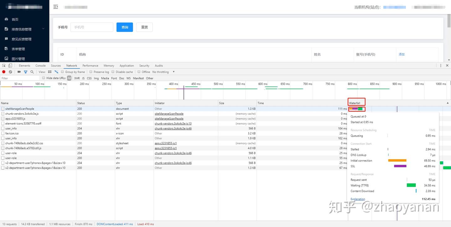 - Waterfall 能分割重要的请求耗时,查看具体请求耗时在哪个地方,鼠标指到相关区域可以看到具体耗时
